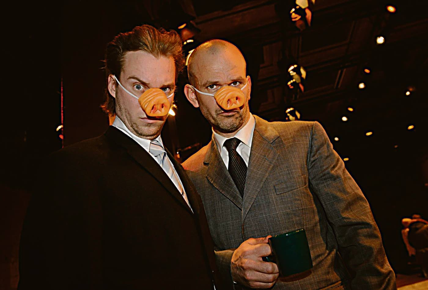 Näyttelijät taipuvat moneksi Ryhmäteatterin Eduskunnassa. Välillä ollaan omana itsenään, seuraavassa hetkessä suolletaan tekstiä ihan sikana. Mitro Härkönen (vas) ja Robin Svartström. Kuva: Lehtikuva/ Jarno Mela