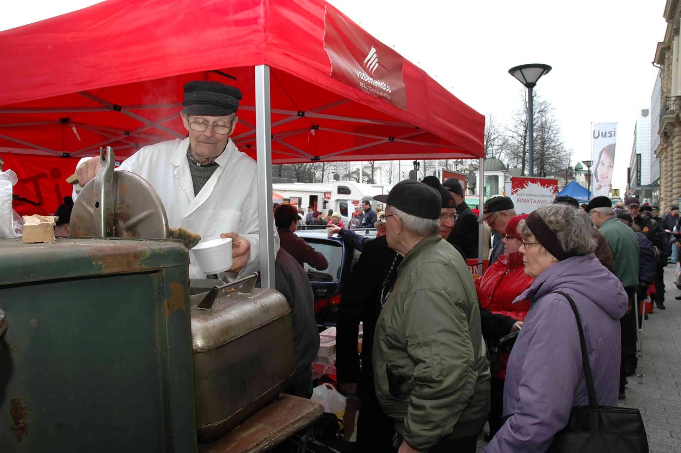 Leo Järvenpää kauhoi Hämeenlinnan torin laidalla halullisten kippoihin yli neljäsataa annosta maukasta hernekeittoa.