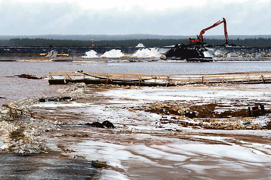 Suojaamattomat altaat ovat eläimille riski. Kuvassa vuotanut kipsisakka-allas Talvivaaran kaivosalueella 15. marraskuuta 2012. Kuva: Lehtikuva/ Kimmo Rauatmaa