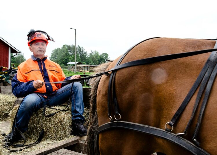 Työhön lähtiessään Johansson valjastaa työkaverinsa, pakkaa mukaan eväät kummallekin ja moottorisahan tankkiin täytettä. Kesällä hevonen vetää kärryjä, talvella rekeä.