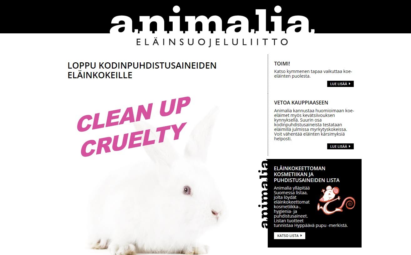 Animalia ja sen koe-eläinten suojelun kattojärjestö ECEAE (The European Coalition to End Animal Experiments) aloittavat yhdessä muiden jäsenjärjestöjen kanssa Euroopan laajuisen Clean Up Cruelty -kampanjan kodinpuhdistusaineiden eläinkokeita vastaan. Suomessa kampanjasta ja siihen liittyvästä vetoomuksesta vastaa Animalia.