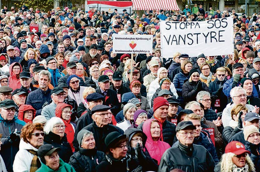 Noin 10 000 ihmistä osallistui mielenosoitukseen, joka järjestettiin Vaasassa keskussairaalan ja ruotsinkielisten sote-palvelujen puolesta 8. lokakuuta. Kuva: Lehtikuva/Marcus Lillkvist /SPT