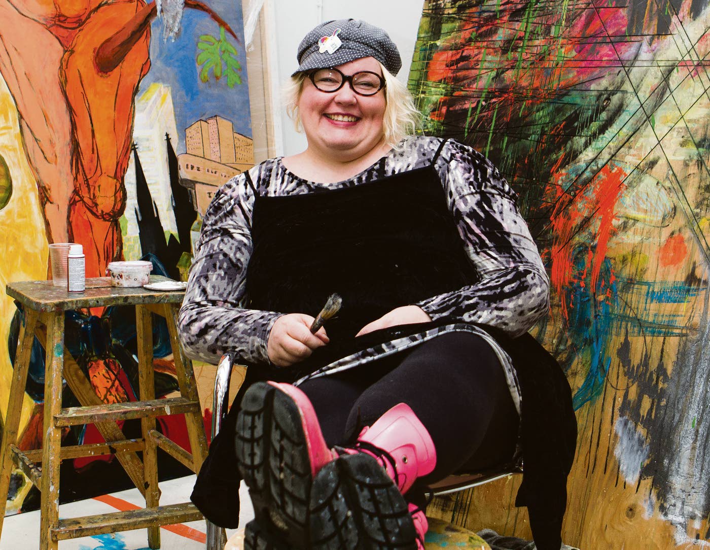 – Olen isokokoinen nainen, ylipainoinen, kuten sanotaan. Töissäni mietin muun muassa mitä naiseus on, sitä että olen arvokas ihminen, vaikka olisin kuinka iso. Pohdin maalauksissa tarvitseeko minun olla nainen. Naisella on oikeus korostaa myös miehisiä puolia itsessäni.