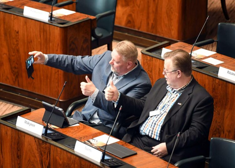 Perussuomalaisten uudet kansanedustajat Jukka Mäkynen ja Veijo Niemi (oik) ottivat selfien ennen uuden eduskunnan ensimmäisestä täysistuntoa keskiviikkona 24. huhtikuuta. Kuva: Lehtikuva/Jussi Nukari