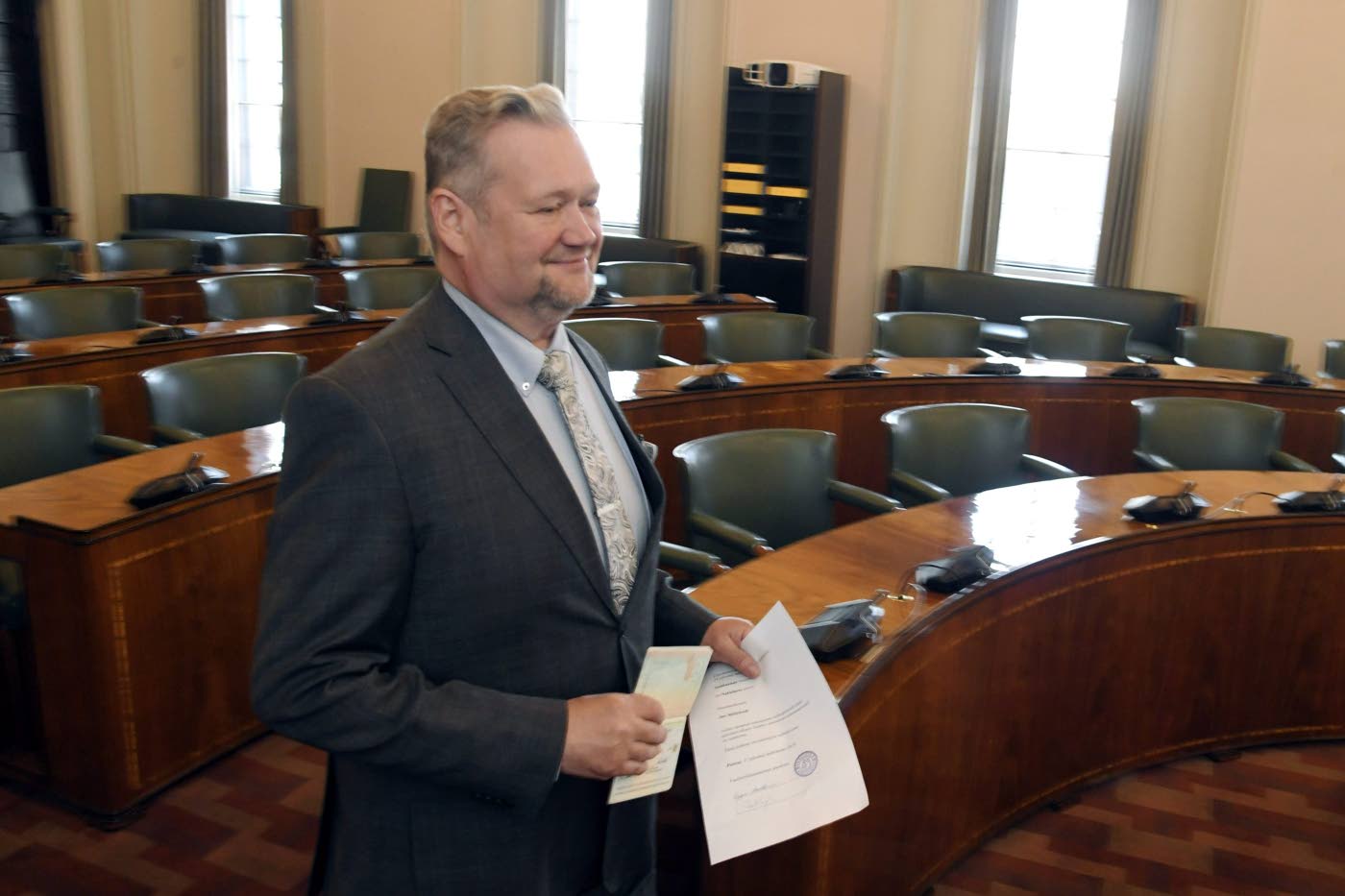 Jari Myllykoski uusi kansanedustajan valtakirjansa kevään ensimmäisissä vaaleissa.