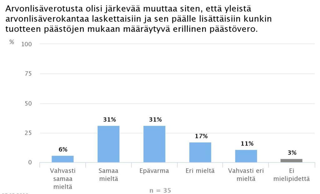 Ekonomeista 37 prosenttia katsoo, että arvonlisäverotusta olisi järkevää muuttaa siten, että yleistä arvonlisäverokantaa laskettaisiin ja sen päälle lisättäisiin kunkin tuotteen päästöjen mukaan määräytyvä päästövero.