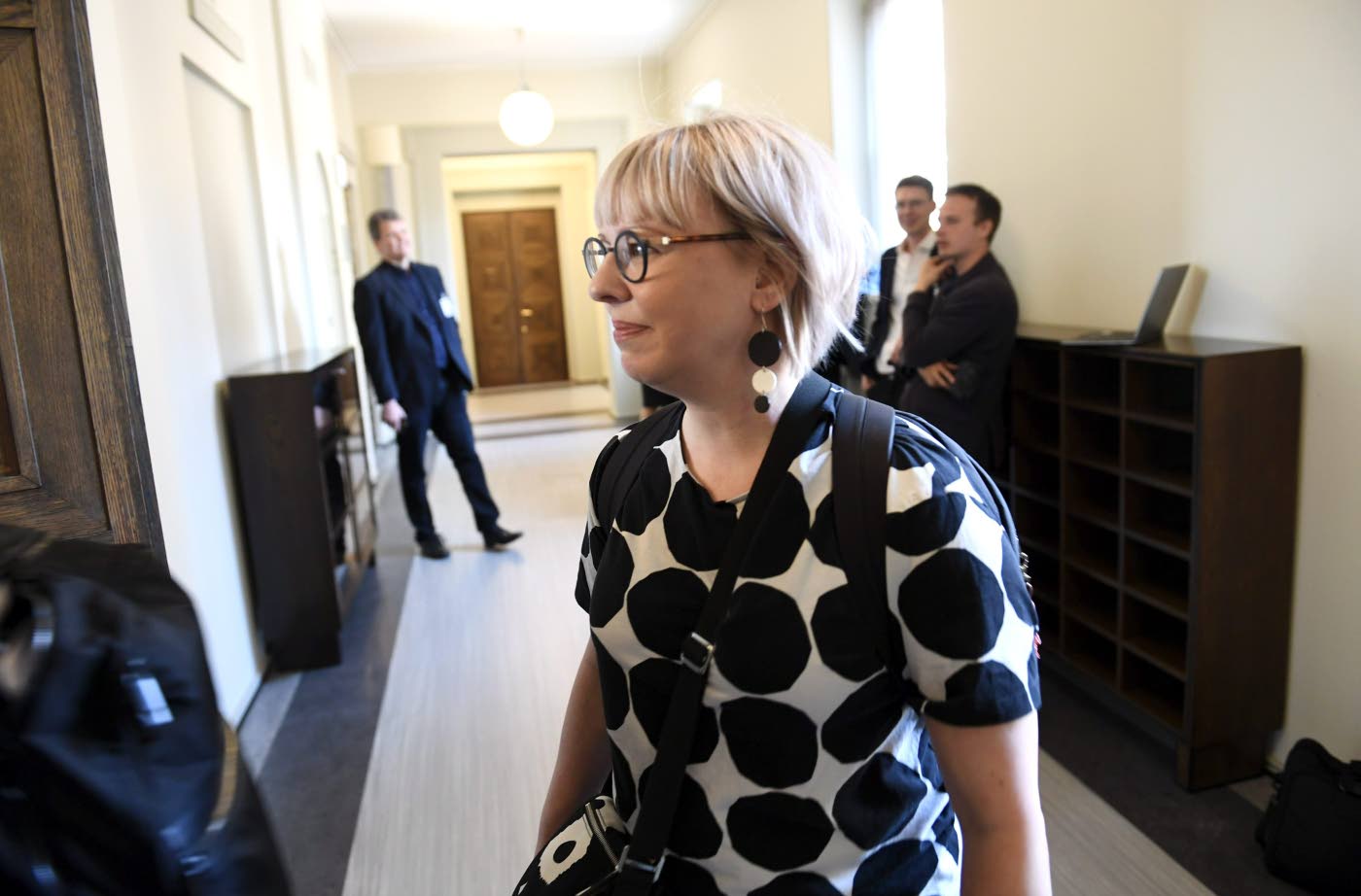 Vasemmistoliiton eduskuntaryhmän puheenjohtaja Aino-Kaisa Pekonen menossa eduskuntaryhmän kokoukseen tiistaina 21. toukokuuta. Kuva: Lehtikuva/Martti Kainulainen