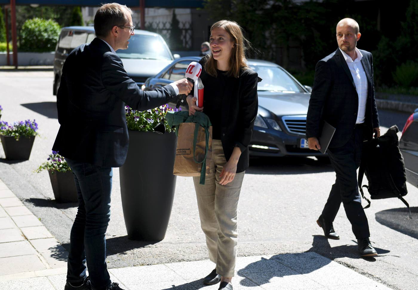 Iltalehden toimittaja Lauri Nurmi haastattelee vasemmistoliiton puheenjohtajaa Li Anderssonia hänen saapuessa hotelli Korpilammelle Espooseen maanantaina. Taustalla vasemmistoliiton viestintä- ja politiikkatiimin vetäjä Touko Sipiläinen. Hallituspuolueet kokoustavat maanantain Korpilammella. Kuva: Lehtikuva/Antti Aimo-Koivisto