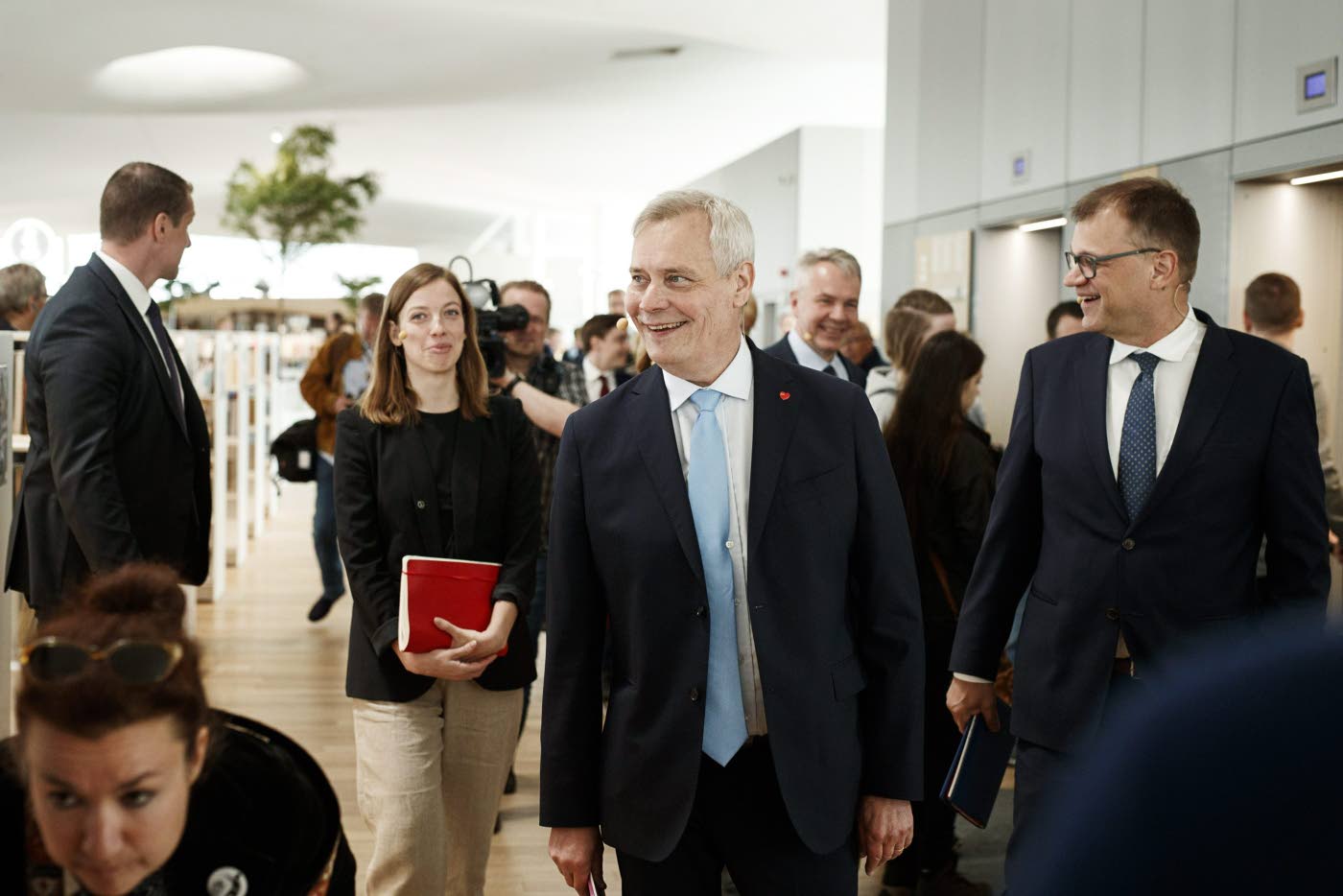 Hallitusneuvotteluihin osallistuneiden puolueiden puheenjohtajat saapuivat Oodissa pidettyyn tiedotustilaisuuteen hymyillen. Kuva: Lehtikuva/Roni Rekomaa