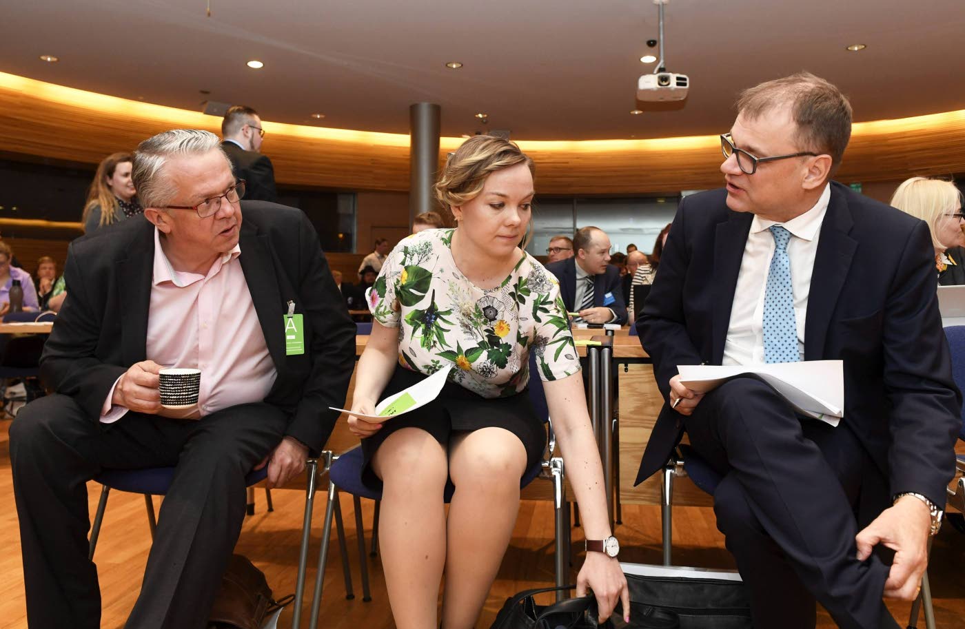 Juha Rehula, Katja Kulmuni ja puheenjohtaja Juha Sipilä keskustan puoluevaltuuston ja eduskuntaryhmän yhteiskokouksessa eduskunnan Pikkuparlamentissa keskiviikkona. Kuva: Lehtikuva/Vesa Moilanen