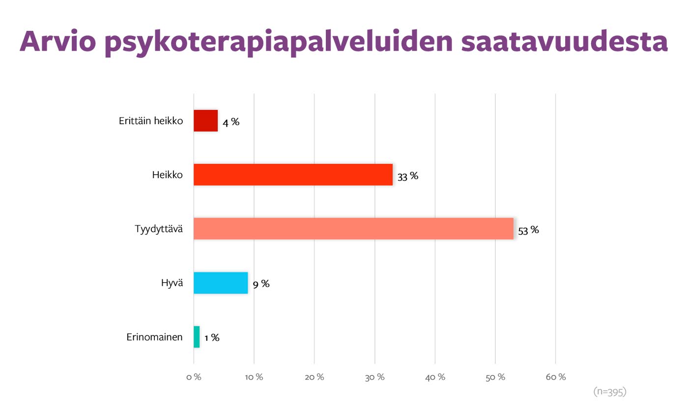 Yhteiskunnallisen yrityksen Minduun teettämän kyselyn perusteella psykoterapeuteista vain 10 prosenttia arvioi psykoterapian saatavuuden hyväksi tai erinomaiseksi.