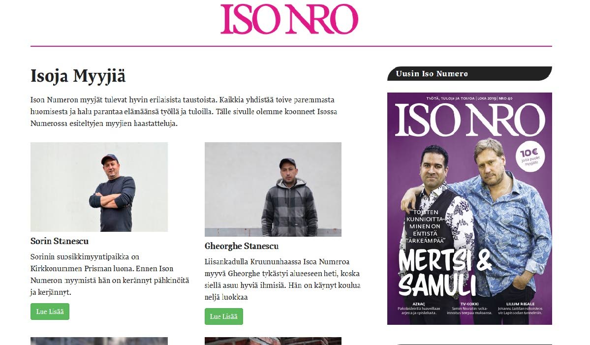 – Eriarvoistuminen, köyhyys ja ihmisten liikkuvuus ovat Suomessakin yhä ajankohtaisempia asioita, ja ne ovat Ison Numeron työn ytimessä. Lehti paitsi käsittelee niihin liittyviä kysymyksiä journalistisessa mielessä, mutta myös konkreettisesti vaikuttaa kehitykseen tarjoamalla kenelle tahansa matalan kynnyksen mahdollisuuden ansaita lisätuloja, Vehkasalo toteaa.