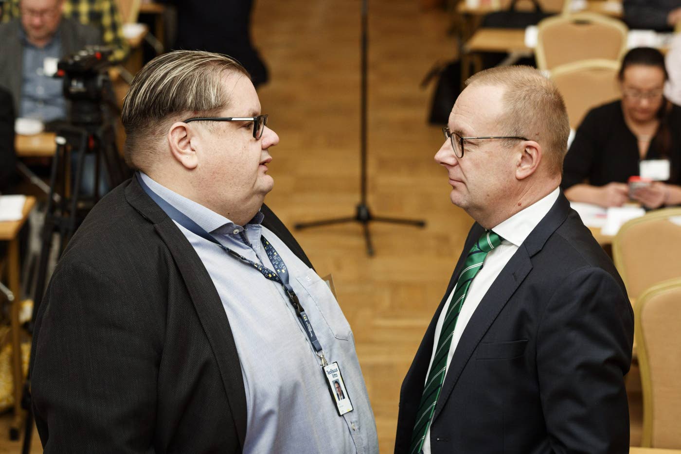 Teollisuusliiton varapuheenjohtaja Turja Lehtonen (vas.) ja SAK:n puheenjohtaja Jarkko Eloranta keskustelivat SAK:n edustajistossa. Kuva: Lehtikuva/Roni Rekomaa