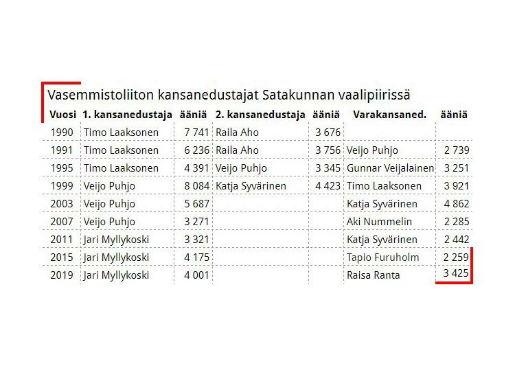 Satakunnassa valittiin kaksi vasemmistokansanedustajaa vielä vuoden 1999 vaaleissa, sen jälkeen yksi kansanedustaja. Vaalipiiristä valittiin 12 kansanedustajaa vuonna 1991, nykyään vain kahdeksan.