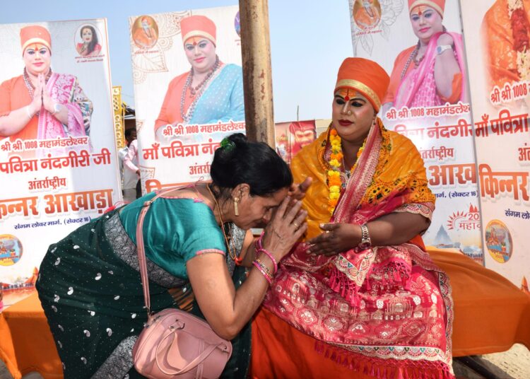 Eräs kylpijöistä on sahraminväriseen kaapuun ja päähineeseen pukeutunut Pavitra Nandagiri, yksi transsukupuolisten lahko Kinnar Akhadan korkea-arvoisimmista munkeista. Kumppanuus uskonnollisten pyhimysten ja trans-johtajien välillä syntyi kymmenen vuotta sitten, kun transsukupuoliset onnistuivat rekisteröimään oman ”akhadan”.