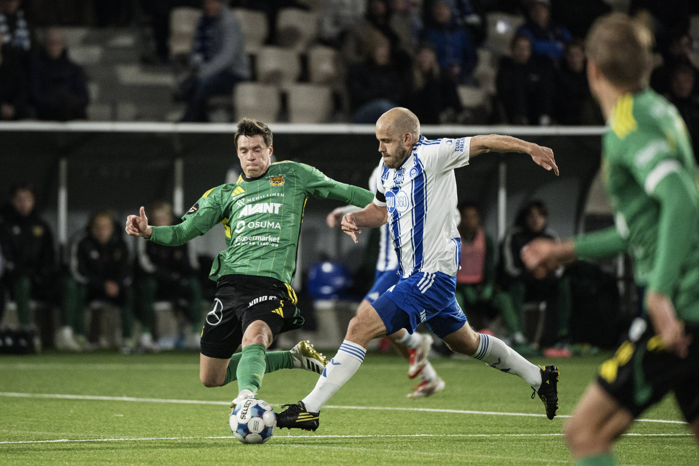 Ilveksen Sauli Väisänen ja HJK:n Teemu Pukki taistelevat pallosta Veikkausliigan Mestaruussarjan ottelussa Helsingissä 29. syyskuuta. Pohjola Vakuutuksen päätös uhkaa ensi kautta. Kuva: Lehtikuva/Roni Rekomaa