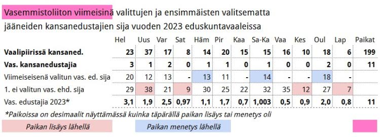 Vuoden 2023 vaalien tulos olisi totisesti voinut olla hyvin erilainen. Jos vasemmistoliitto olisi menettänyt viimeisen paikkansa niissä vaalipiireissä, joissa menetys oli lähellä, olisi puolueella nyt kahdeksan kansanedustajaa. Mutta toisaalta, jos vasemmistoliitto olisi pitänyt paikkansa niissä vaalipiireissä, joissa paikka menetettiin täpärästi, olisi eduskuntaryhmässä nyt 15 kansanedustajaa.