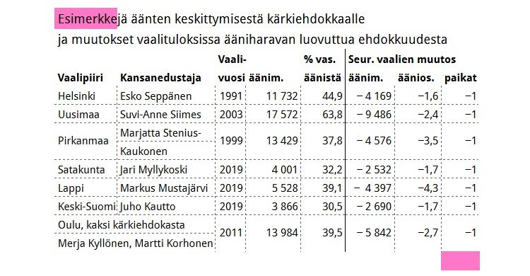 Tämä ei ole ensimmäinen kerta, kun suositun kansanedustajan äänet eivät jää puolueelle, kuten taulukko 2 kertoo. Ääniä ei voi testamentata.