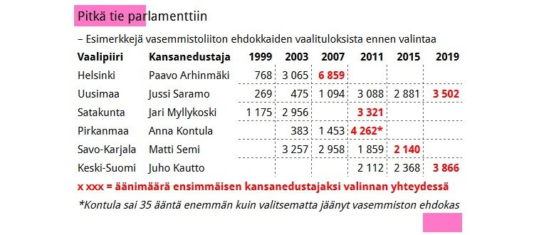 Vasemmistoliiton ehdokkaiden äänimäärien selailu osoittaa, että kaksi tai kolme ehdokasta yleensä saa yli puolet, usein yli 70 prosenttia äänistä. Suurin osa ehdokkaista ilmeisesti kokee olevansa täyte-ehdokkaita. Tämä ei enää käy. Vasemmistoliitto tarvitsee ehdokkaita, jotka uskovat mahdollisuuksiinsa tulla valituksi ja tukiryhmiensä kanssa pyrkivät siihen kaikin voimin.