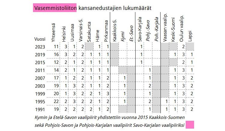 Vasemmistoliitto jäi vuoden 2023 eduskuntavaaleissa ensimmäistä kertaa ilman kansanedustajaa Satakunnassa ja Lapissa, Keski-Suomessa puolue on jäänyt ilman paikkaa vain kerran, vuoden 2015 vaaleissa.