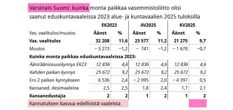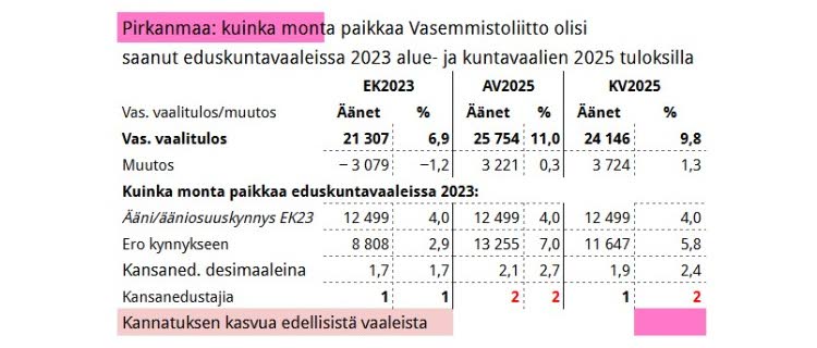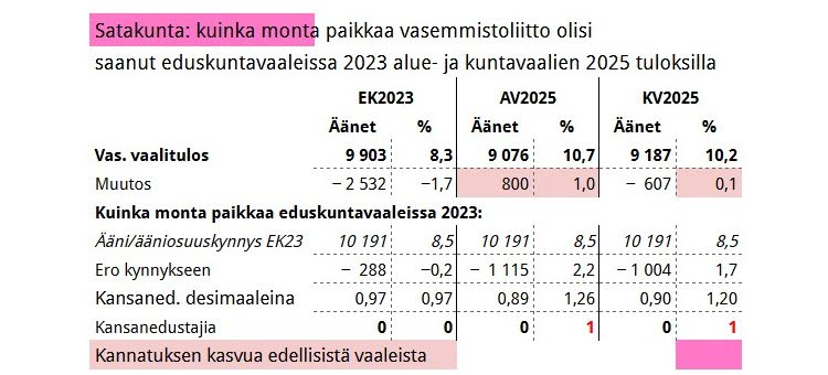 Kevään kuntavaaleissa tulos ei ollut huono, ja aluevaaleissa Satakunnan vasemmisto eteni mukavasti. Sekä kunta- että aluevaalien ääniosuuksilla kansanedustajan paikka olisi säilynyt.