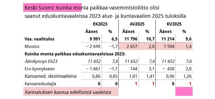 Jos Vasemmistoliitto mielii saada takaisin ja pitää kansanedustajan Keski-Suomessa, on kannatusta lisättävä Jyväskylän ulkopuolella. Keski-Suomen asukkaista 54,4 prosenttia on Jyväskylästä, mutta vasemmistoliiton äänistä sieltä tuli 69,2 prosenttia viime eduskuntavaaleissa, aluevaaleissa peräti 71,8 prosenttia.