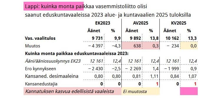 Kevään vaaleissa vasemmistoliiton ääniosuudet pysyivät sillä tasolla, jolla vaalipiiristä saadaan kansanedustaja. Lapin vaalipiirin ongelmana on kannatuksen poukkoilu. Kun ääniosuus kasvoi komeasti Inarissa, 8,9 prosenttiyksikköä aluevaaleissa ja 2,6 prosenttiyksikköä kunnallisvaaleissa, niin vastaavasti kannatuslukemat putosivat Kolarissa 6,5 ja 6,1 prosenttiyksikköä. Lapin kunnissa sitoutumattomien listat saivat suuren kannatuksen.