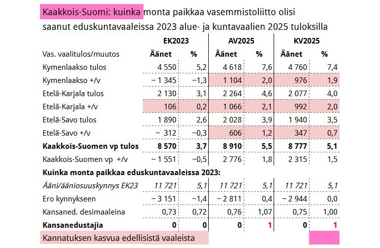Viime eduskuntavaaleissa vasemmistoliitto sai vain 3,5 prosenttia Kaakkois-Suomen äänistä, kun kansanedustajan paikkaan olisi tarvittu 5,1 prosenttia äänistä. Sen jälkeisissä neljässä vaalissa on kuitenkin alkanut uusi kehitys vaalipiirin jokaisella alueella, ja vasemmistoliitto sai komeat 5,5 prosenttia äänistä alue- ja 5,1 prosenttia kuntavaaleissa.