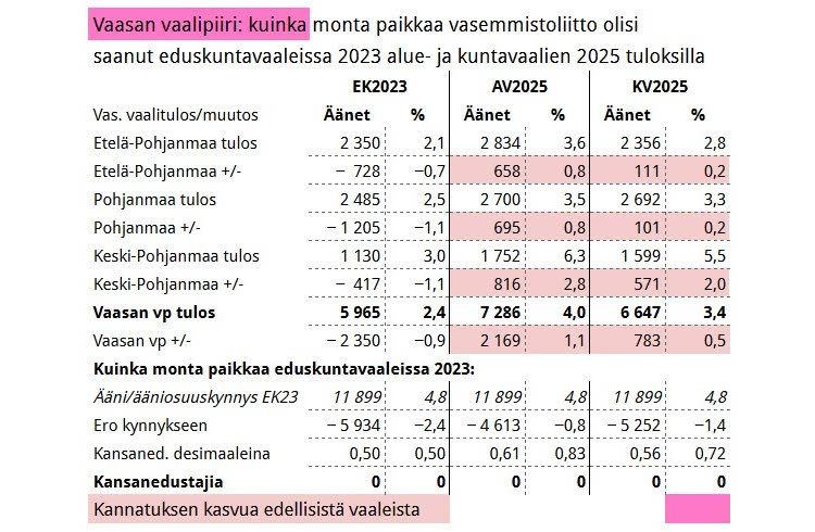 Taulukko 9. Vaasan vaalipiirissä tarvittiin viime eduskuntavaaleissa 4,8 prosentin ääniosuus kansanedustajan saamiseksi. Aluevaaleissa vasemmistoliitto sai 4,0 prosenttia vaalipiirin äänistä, joten suunta on hyvä.