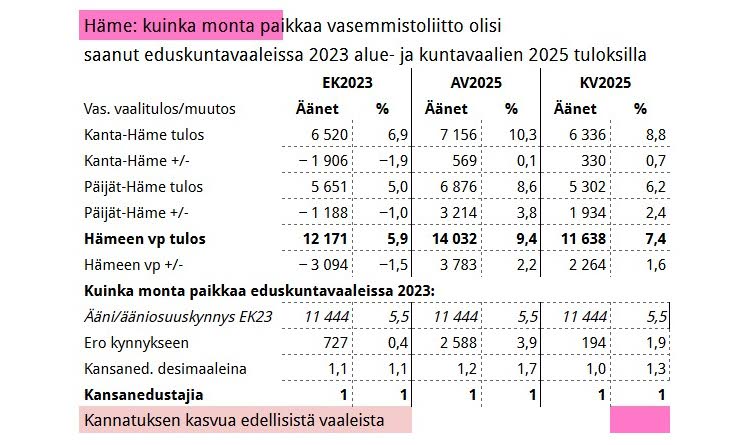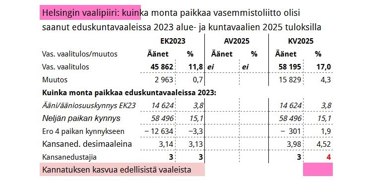 Taulukko 14. Kunta- ja aluevaalien ääniosuuksilla, myös aluevaalien äänillä, vasemmistoliitto olisi saanut kaksi paikkaa viime eduskuntavaaleissa.