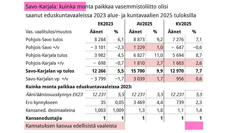 Asetelma on kuitenkin ollut muuttumassa. Vielä vuoden 2023 eduskuntavaaleissa vasemmiston ääniosuus oli korkeampi Pohjois-Savossa kuin Pohjois-Karjalassa, mutta kevään alue- ja kuntavaaleissa Pohjois-Karjala meni ohi. Pohjois-Karjalan Joensuussa, Nurmeksessa, Rääkkylässä ja Tohmajärvellä on kannatusta kasvatettu vähintään 3,5 prosenttiyksikköä. Aluevaaleissa vasemmistoliittoilmiö syntyi rääkkyläläisen Tapio Heinosen kampanjan myötä.