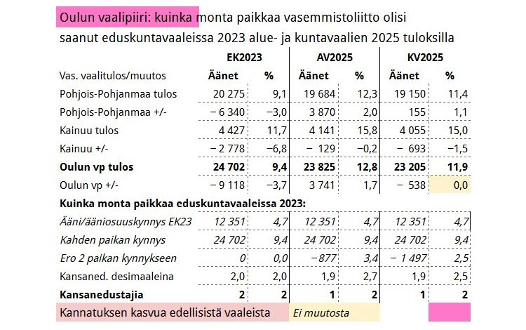 Eduskuntavaaleissa 2019 vasemmistoliitto juhli Oulun vaalipiirissä paluuta kolmen kansanedustajan kantaan. Eduskuntavaaleissa 2023 kolmas paikka menetettiin ja toinenkin paikka oli vakavasti uhattuna. SDP:n lanseeraama ”taktinen äänestäminen” näkyi täällä rumimmillaan. SDP pelotteli äänestäjiä sillä, että tulee oikeistohallitus, jos SDP:stä ei tule suurinta puoluetta.