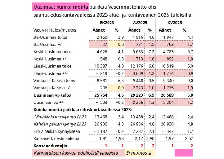 Eduskunta-, kunta ja aluevaalitulosten vertailussa Uudenmaan vaalipiirissä vuodesta 2011 lähtien on vasemmistoliiton ääniosuus ollut korkeimmillaan 6,9 prosenttia aluevaaleissa 2025 ja alimmillaan 4,4 prosenttia eduskuntavaaleissa 2015.