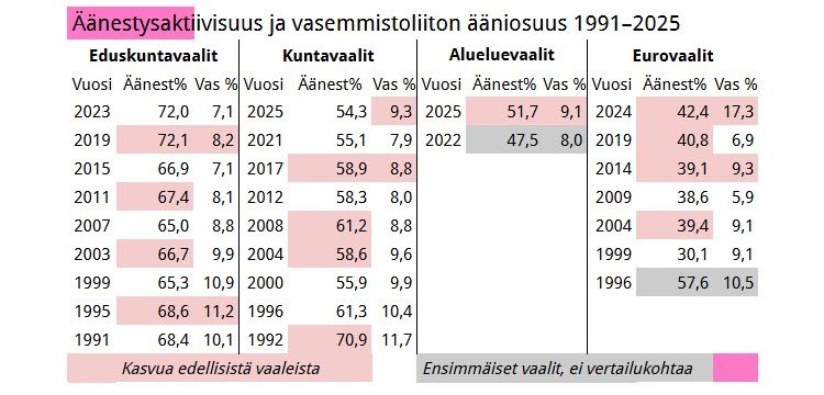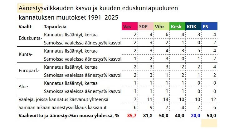 Vasemmistoliitto on saanut eduskunta-, kunta-, alue ja eurovaaleissa yhteensä seitsemän vaalivoittoa. Kuudessa näistä vaaleista on äänestysvilkkaus noussut. Kokoomuksen kannatus on kasvanut samaan aikaan kymmenessä vaalitapahtumassa, joista vain kahdessa vaalivilkkaus on noussut.