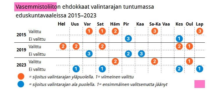 Viime eduskuntavaaleissa kansanedustajan paikkaan vaadittiin 8,5 prosenttia äänistä Satakunnan vaalipiirissä, 7,6 prosenttia Keski-Suomen vaalipiirissä ja 12,4 prosenttia Lapin vaalipiirissä. Kun vasemmistoliitto sai Satakunnassa 8,3 prosenttia, Keski-Suomessa 6,5 ja Lapissa 9,9 prosenttia äänistä, jäivät vasemmistoliiton kannattajat näissä vaalipiireissä ilman kansanedustajaa. Tätä vääristymää tuskin korjataan lähivuosina. Mutta vasemmistoliiton kannatuksen vahvistuminen vuoden 2023 eduskuntavaalien jälkeen kertoo, että kansanedustajien paikat näissä vaalipiireissä todennäköisesti saadaan takaisin vuoden 2027 vaaleissa.