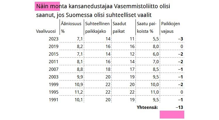 Taulukko 3. Suhteellisen pienikin kannatuksen lasku voi aiheuttaa suuria muutoksia puolueen kansanedustajien lukumäärässä. Kun vasemmistoliiton kannatus nousi 1,1 prosenttiyksikköä vuoden 2019 eduskuntavaaleissa, paikkaluku nousi neljällä kuuteentoista, mutta samansuuruinen kannatuksen lasku vuonna 2023 johti viiden paikan menetykseen. Vuoden 2019 vaaleissa vasemmistoliiton kansanedustajien määrä vastasi suhteellista kannatusta, mutta vuosina 2015 ja 2023 vasemmistoliitto olisi saanut 14 paikkaa, jos vaalit olisivat aidosti suhteelliset.