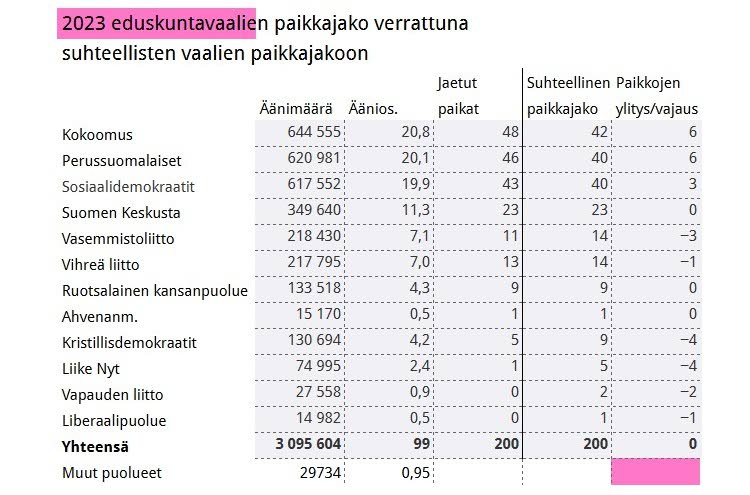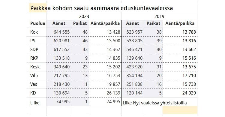 Taulukko 3 auttaa myös ymmärtämään, miksi vasemmistoliitto sai vuoden 2015 vaalissa 12 paikkaa ja vuoden 2023 vaaleissa vain 11 paikkaa, vaikka puolueen ääniosuus oli samat 7,1 prosenttia kummassakin vaalissa.