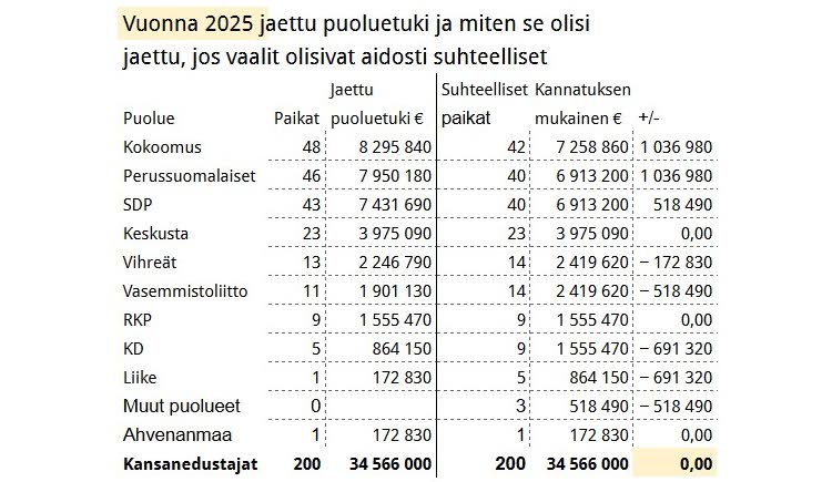 Tänä vuonna kokoomus ja perussuomalaiset saivat vaaleissa saamaansa kannatukseen nähden miljoona euroa ylimääräistä puoluetukea, kun puolestaan vasemmistoliitto sai puoli miljoonaa euroa liian vähän.