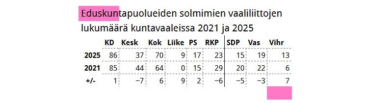 Vihreiden saldo oli neljä lisäpaikkaa. Ne tulivat Hankasalmella, Mustasaaressa, Nivalassa ja Saarijärvellä.
