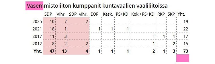 Kevään 2025 kuntavaaleissa vasemmistoliitto solmi vaaliliiton 19 kunnassa. Vaaliliittojen määrä oli samaa luokkaa kuin kuntavaaleissa vuodesta 2012 lähtien, mutta hyväksi uutiseksi voidaan lukea se, että vaaliliittoja sovittiin vain SDP:n ja vihreiden kanssa, ei yhdenkään oikeistopuolueen kanssa, kuten aikaisemmin. Sosiaalidemokraattien kanssa solmittiin kymmenen vaaliliittoa, vihreiden kanssa seitsemän, ja kahdessa vaaliliitossa jäseninä olivat vasemmistoliitto, SDP ja vihreät.