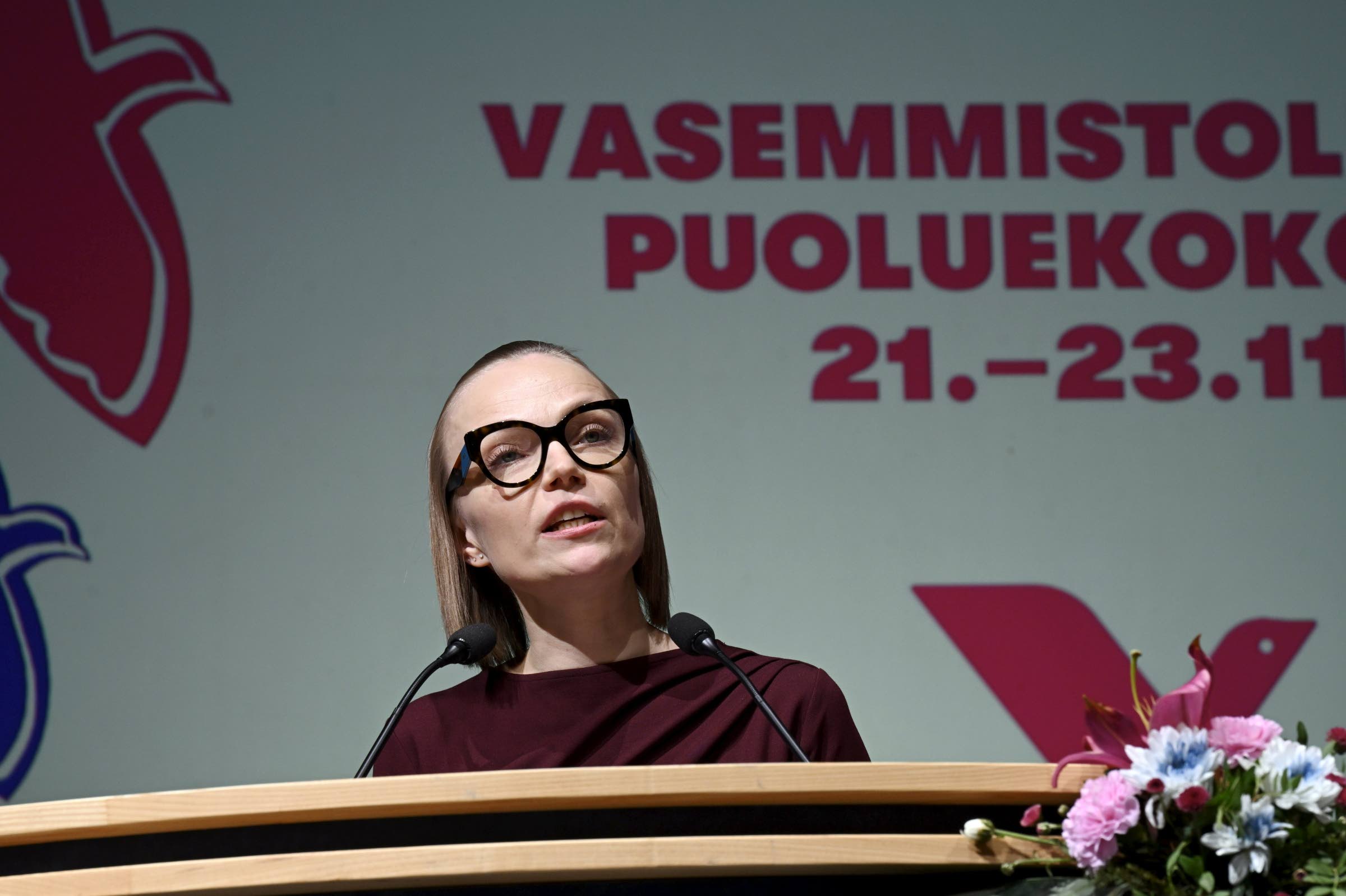 Heti puheensa jälkeen Minja Koskela kukitettiin uudelle kaudelle vasemmistoliiton puheenjohtajaksi.