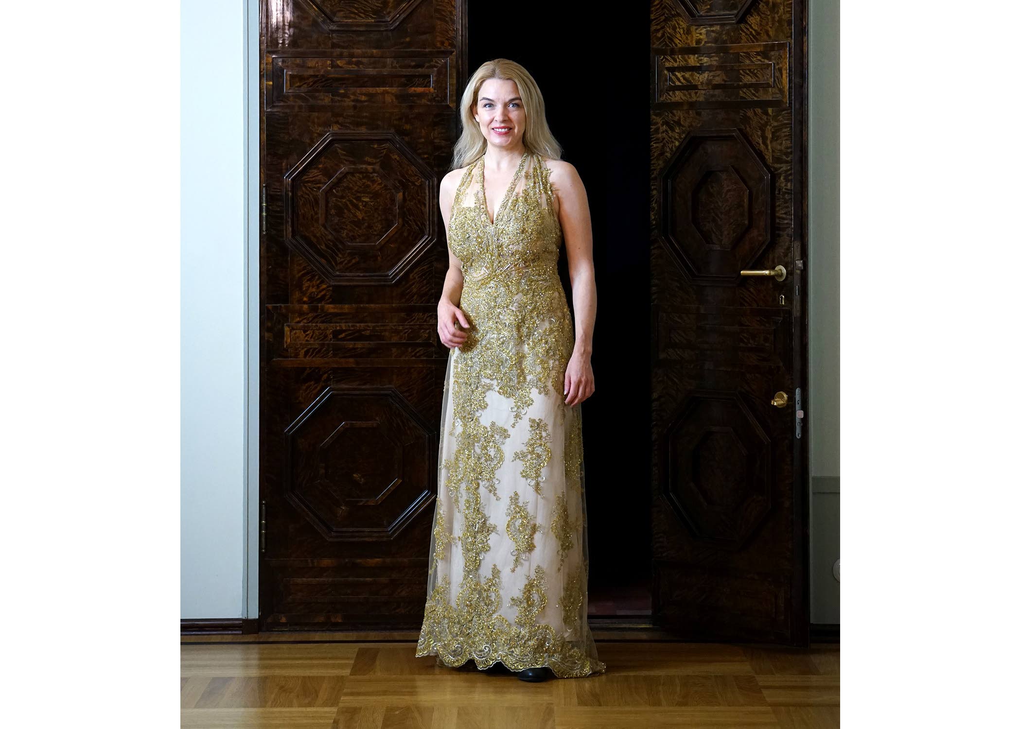 Vasemmistoliiton kansanedustaja Mai Kivelä pukeutuu presidentin itsenäisyyspäivän vastaanotolle kultaiseen pitsipukuun, jonka on suunnitellut Riikka Ikäheimo.