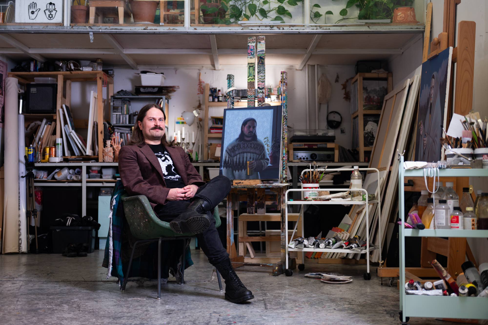 – Leikittelen omakuvissani minuudellani ja kaivan esiin erilaisia versioita itsestäni. Millainen olen? Millainen voisin olla? Yhdessä maalauksessa olen ”sad boy prince” ja toisessa tyrmää vartioiva ”goblin”. Maalaaminen on minulle meditatiivista toimintaa, ja mietin teoksia työstäessäni paljon omia mielenliikkeitäni.