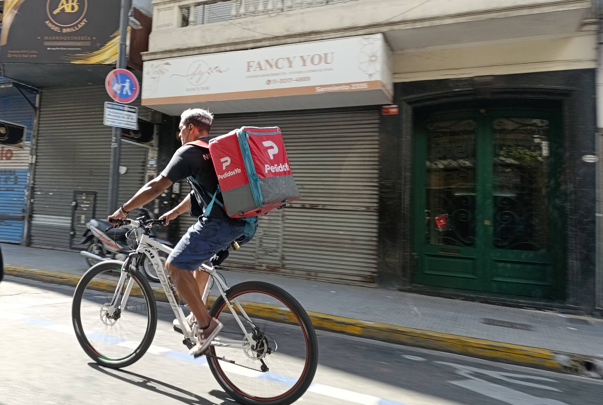 Ruokalähetti lähellä Oncen rautatieasemaa Buenos Airesissa. Vakituisten työpaikkojen puute on lisännyt lähettien määrää, joka on puolestaan vähentänyt yksittäisten lähettien kuljetuksia.