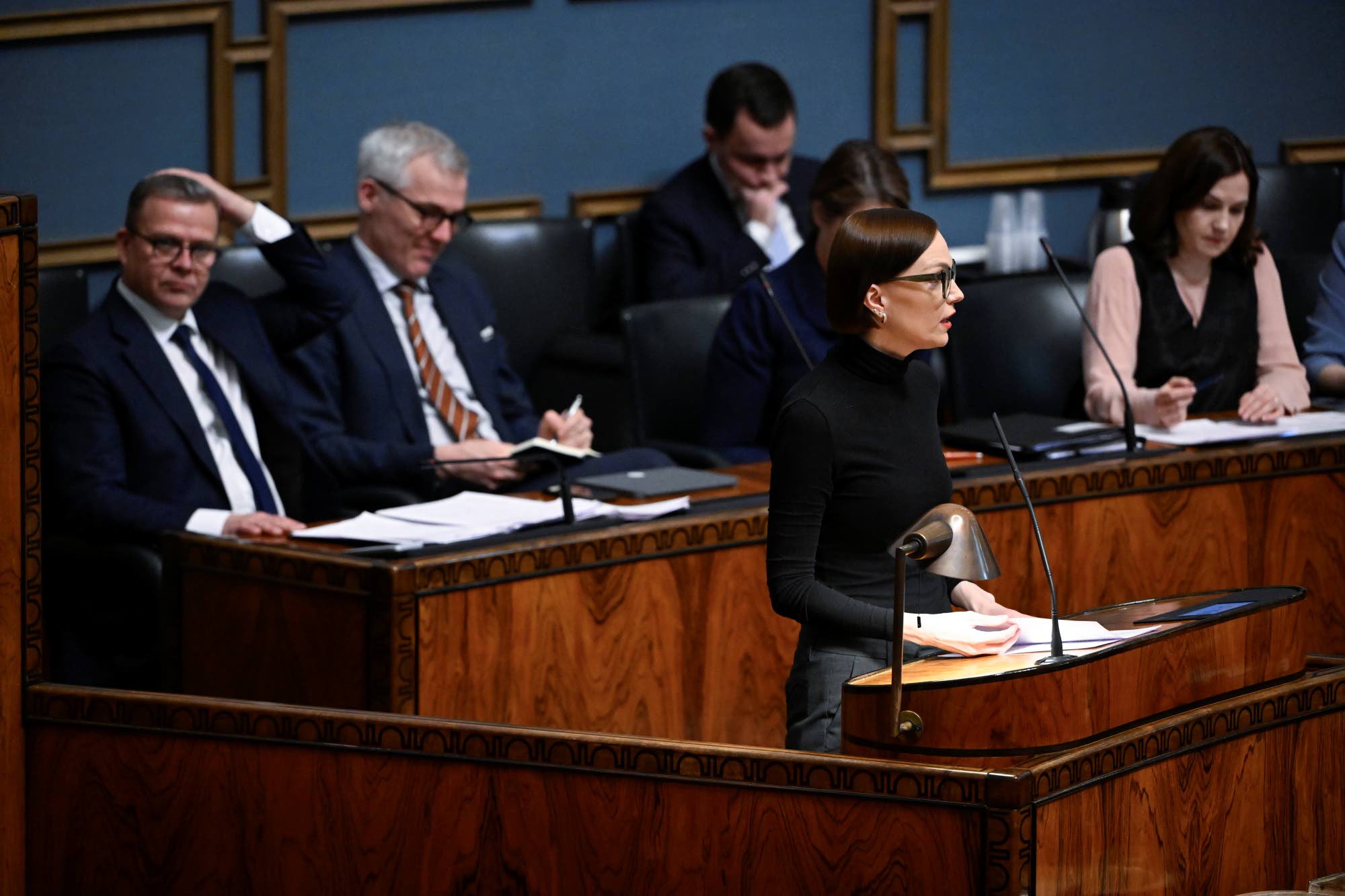 Vasemmistoliiton puheenjohtaja Minja Koskela puhui eduskunnan täysistunnossa keskiviikkona. Taustalla pääministeri Petteri Orpo (kok.), opetusministeri Anders Adlercreutz (r.), sosiaali- ja terveysministeri Wille Rydman (ps.) ja sosiaaliturvaministeri Sanni Grahn-Laasonen (kok.).