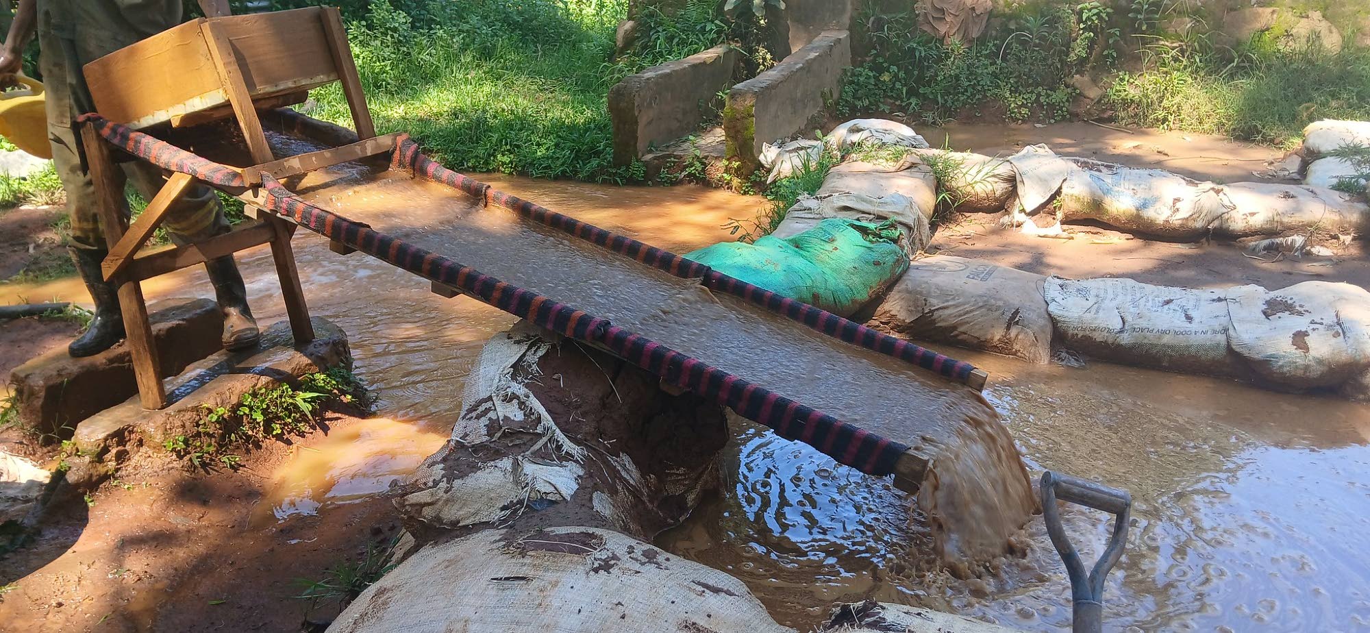 Pienkaivaja käyttää huuhteluränniä kullan erottamiseen murskatusta malmista. Kuva: IPS/Chemtai Kirui